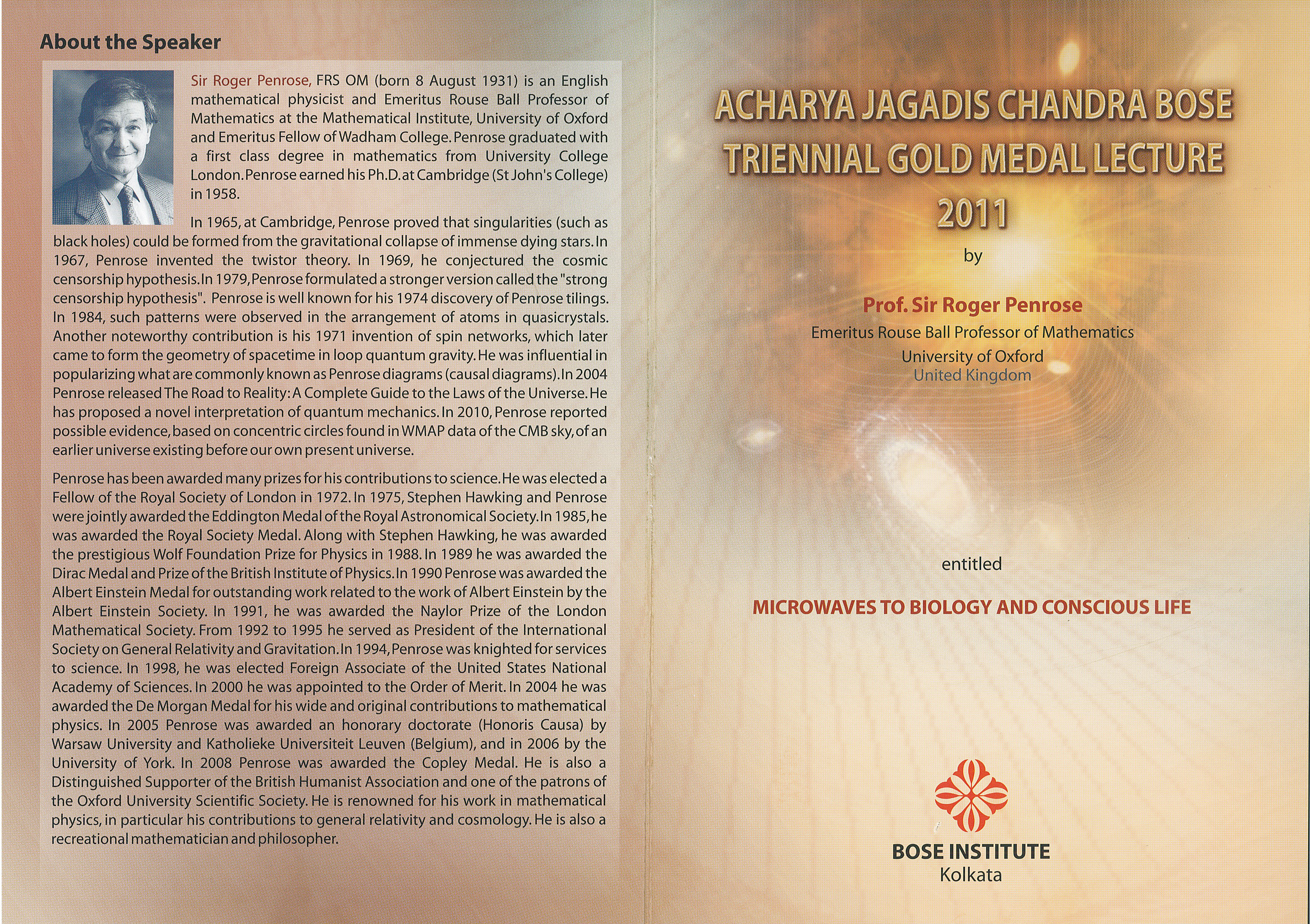 Acharya Jagadish Chandra Bose Triennal Gold Medal Lecture 2011: Microwaves to biology and conscious life by Sir Roger Penrose